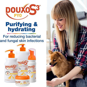 DOUXO® S3 PYO Mousse 是一款免沖洗型產品,專門配製用於對細菌和/或酵母失衡的皮膚進行消毒,同時由於每種成分都經過精心挑選,因此可以尊重、舒緩和強化寵物的肌膚。