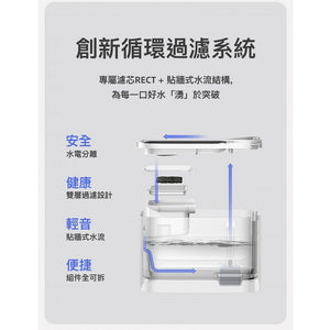 這款智能寵物飲水噴泉提供多種模式,包括連續流或間歇模式,可根據寵物的偏好進行自定義。多層過濾器利用單向循環過濾系統去除毛髮、沉積物和污垢,為寵物提供衛生和純淨的飲用體驗。