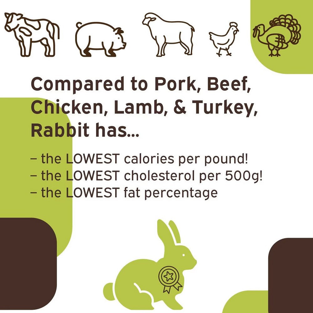 Higher in protein, lower in fat, lower in calories and lower in cholesterol than chicken, veal, turkey, lamb, beef or pork. Because it is easy to digest, vets frequently recommend rabbit for dogs with sensitive stomachs and gastrointestinal, skin or pancreatic issues.