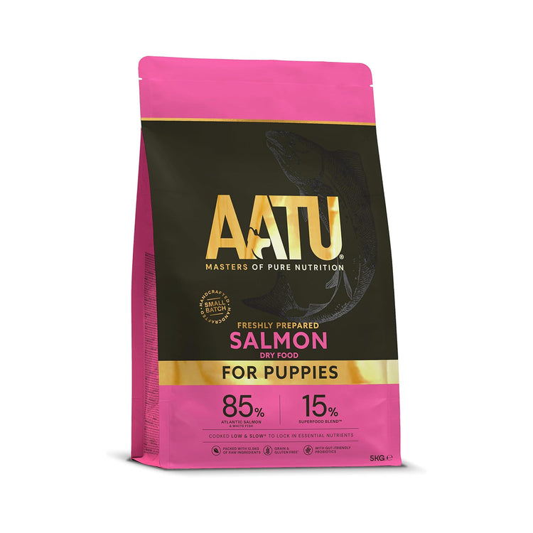 Give your puppy the best start in life with AATU Salmon Dog Dry Food for Puppies, a premium grain-free recipe made with 85% Atlantic salmon and white fish, plus 15% of the unique Superfood Blend™ of fruits, vegetables, herbs, and botanicals. Every bite is formulated to support healthy growth, vitality, and digestion throughout your puppy’s first year.
