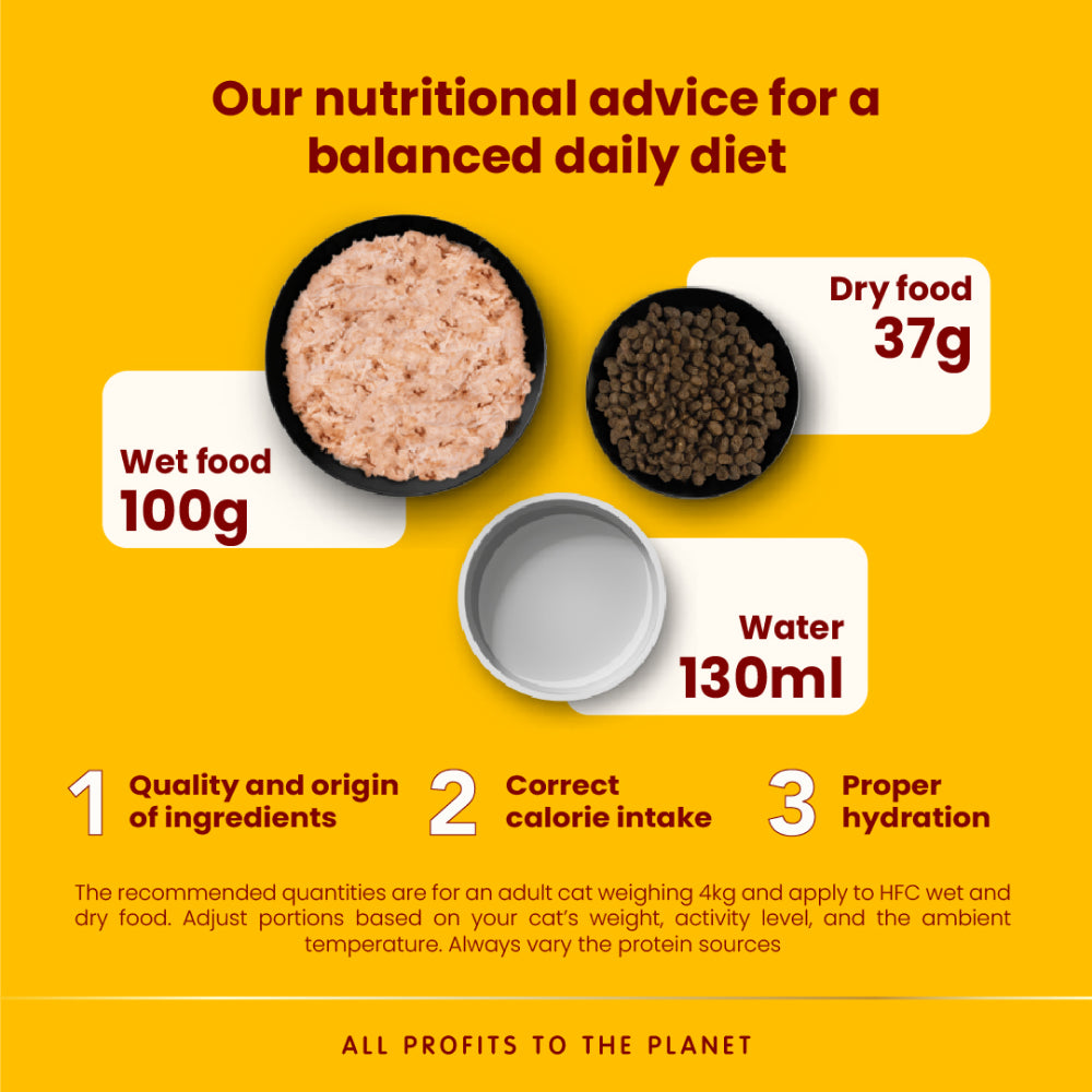 As a mono-protein formula, it helps reduce the risk of food intolerance and allergic reactions. It can be served on its own or combined with a complete and balanced diet to add variety, hydration, and natural taste to your cat’s meals.