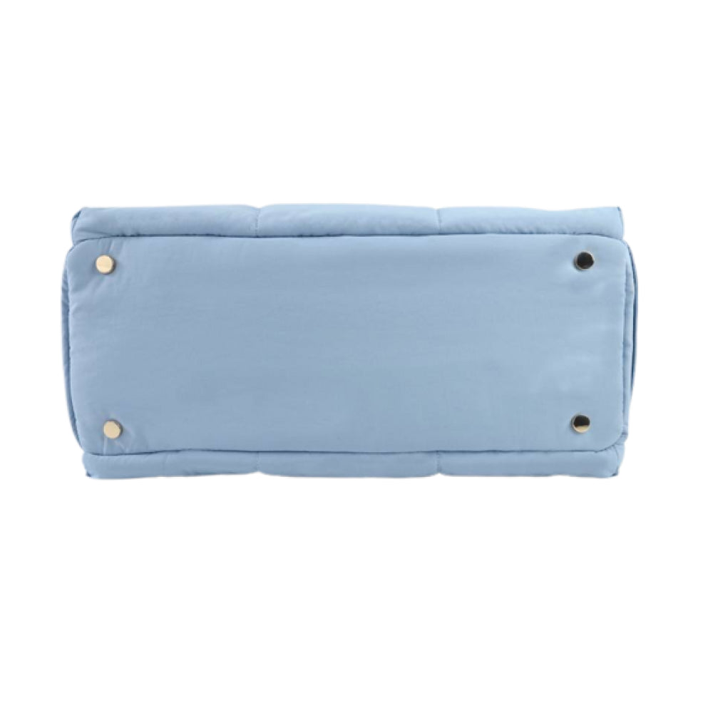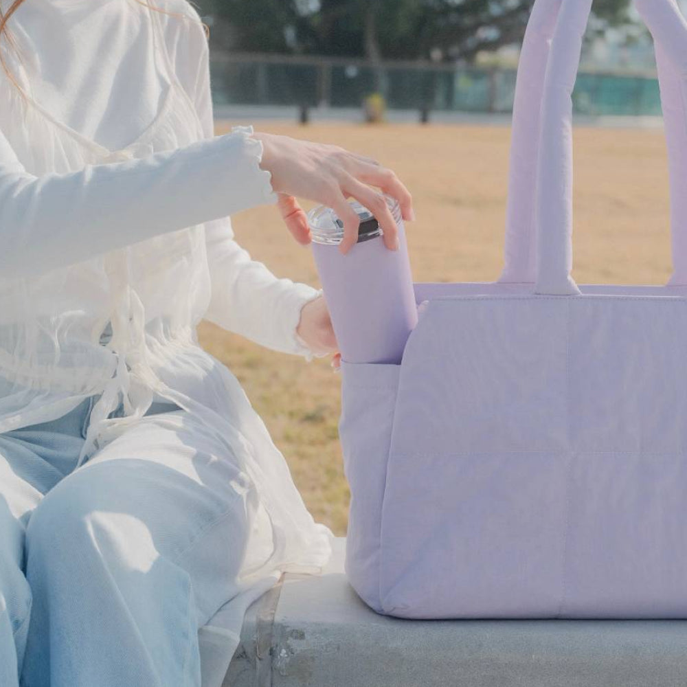 外層材質: 順滑防水面料配合絎縫細節與蓬鬆手挽