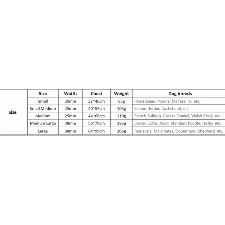 Small: Width 20 mm, Chest 32–45 cm, Weight 65 g, Suitable for Pomeranian, Poodle, Maltese, IG, etc.Small Medium: Width 25 mm, Chest 40–57 cm, Weight 105 g, Suitable for Bichon, Terrier, Dachshund, etc.