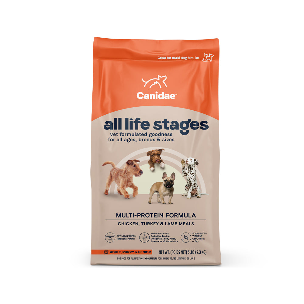 Canidae® 全年齡狗乾糧專為所有年齡、品種及大小的狗狗製作。這種"一袋裝"的混合乾糧讓飼養多隻狗狗家庭的用餐時間,變得輕而易舉。只飼養一隻狗狗的家庭也可享受一袋裝的好處——不需猜測您的狗狗年齡、品種或大小而換糧。專為所有年齡層配製,您的狗狗將享受優質成分,含豐富的必需氨基酸、奧米加 3 及 6 脂肪酸以及最佳蛋白質。所有生命階段都含營養豐富的配方,不含粟米、小麥或大豆。一袋裝對所有狗狗都有益處。