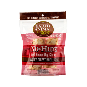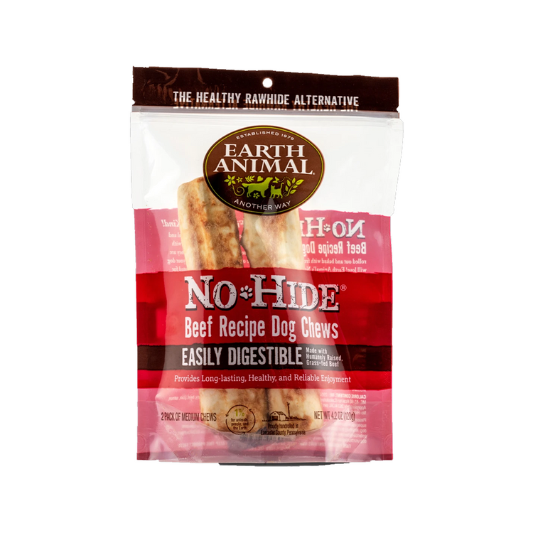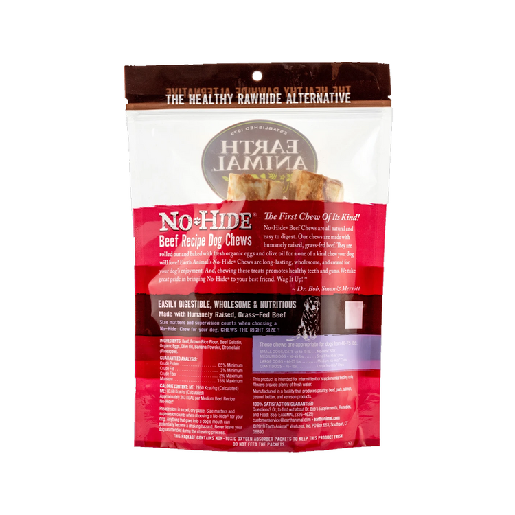 Earth Animal's Chews are always made from Hormone Free Beef with no added chemicals, hormones or steroids. No-Hide Beef Chews give new meaning to dog chews. Try the safer, healthier alternative today! Helps to eliminate boredom!! Keep your dog busy the natural way.