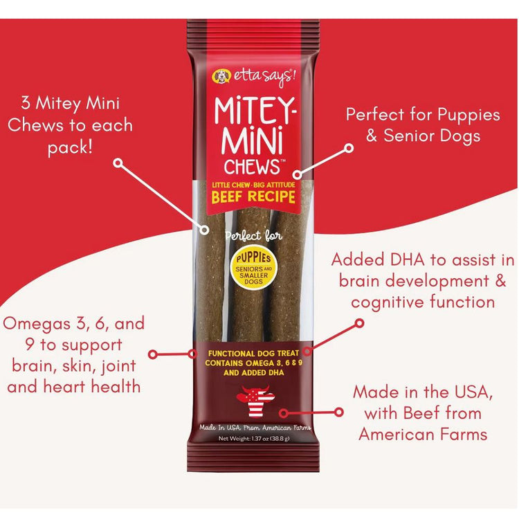 • These mini-chews are a tasty, chewy treat for your puppy or adult pooch.
