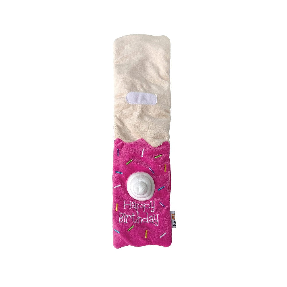 Shaped like a festive birthday roll cake, it features hidden treat pockets and a plush birthday candle that your pup can pull out for an extra surprise.