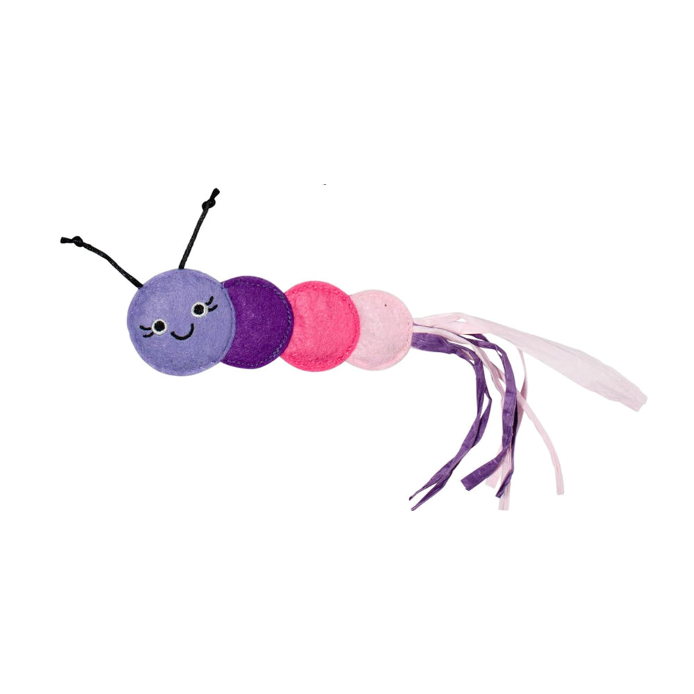 玩具內含北美貓薄荷,能吸引貓咪主動探索與遊玩;內部響紙讓每次拍打更具樂趣。瓢蟲配有鈴鐺,提供額外聲響刺激,而毛毛蟲上的拉菲草絲帶能引起貓咪追逐與撲擊的興趣。