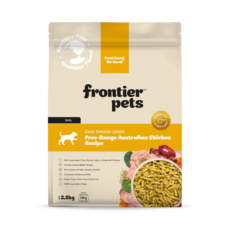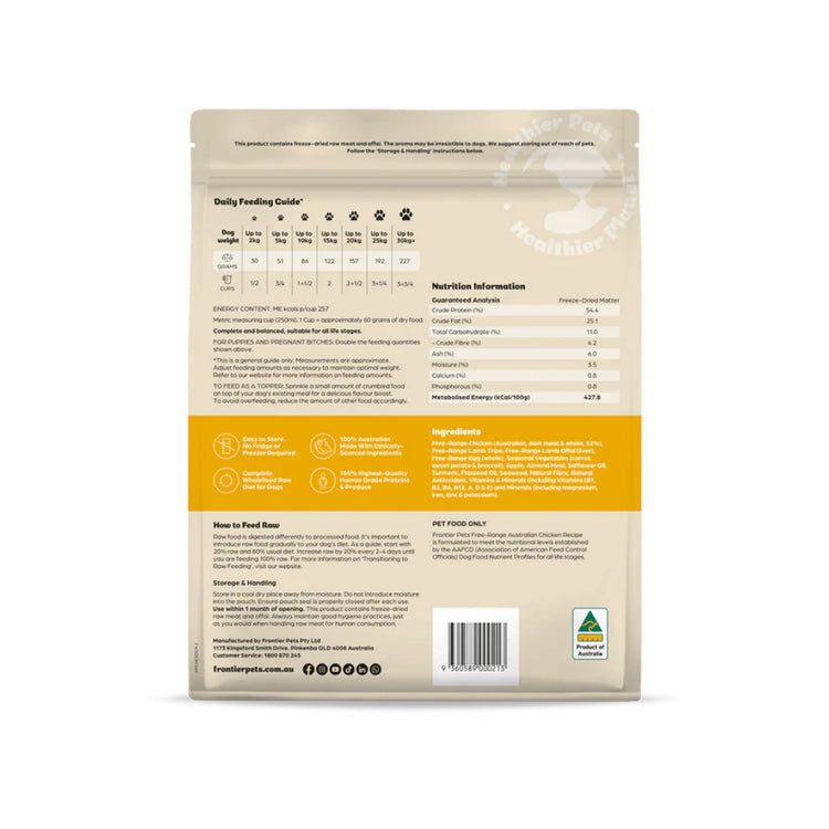 Frontier Freeze-Dried Free-Range Chicken Dog Food is crafted with ethically sourced chicken and organic produce from sustainable Australian farms. This premium human grade recipe is designed to provide a biologically appropriate raw diet in a convenient freeze dried format.