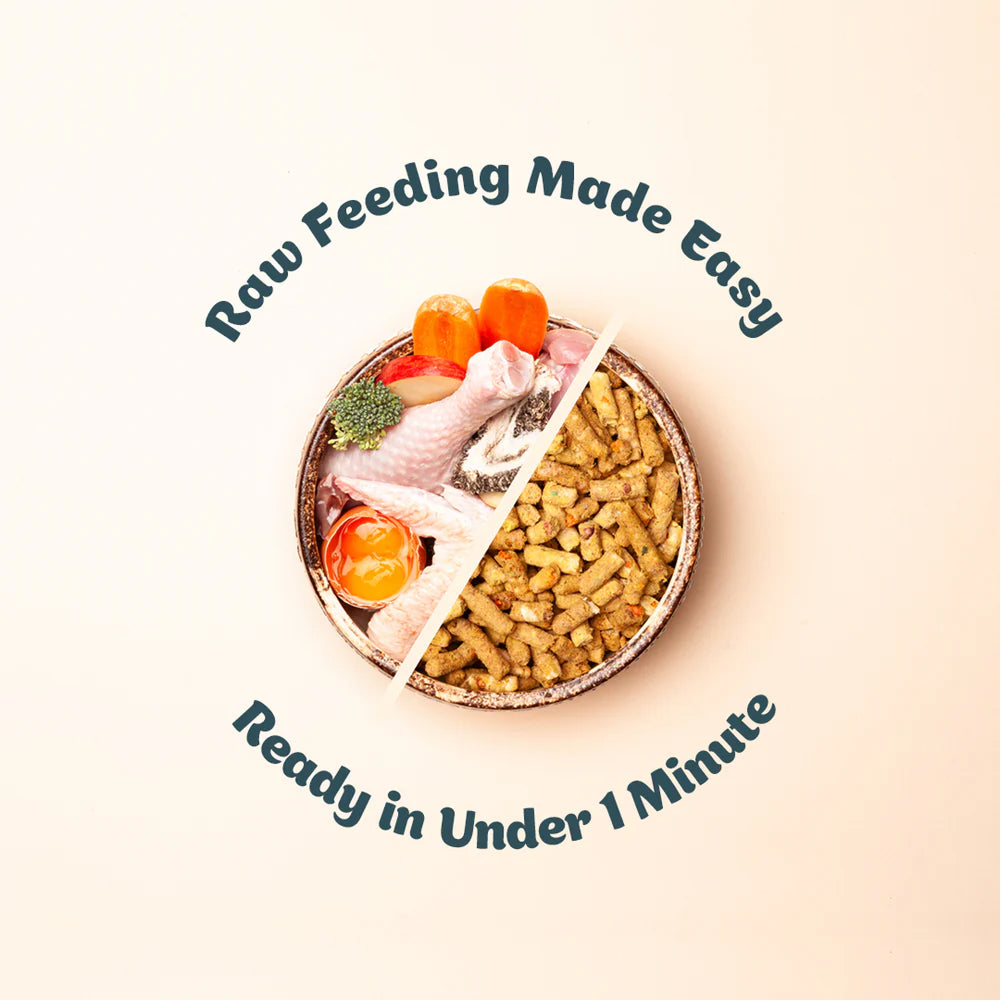 The formula includes chicken meat, organs, and bones, combined with green tripe, fruits, vegetables, free range eggs, hemp seed powder, green lipped mussels, and natural boosters such as turmeric and seaweed. Added vitamins and chelated minerals ensure balanced nutrition. Gently freeze dried to preserve flavor and nutrients, this food rehydrates quickly with warm water and requires no refrigeration.