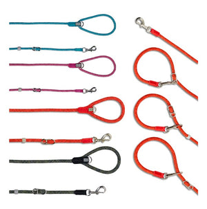 The Leader Leash is equipped with an extra buckle and a bespoke hook allowing for making an integrated collar or a slip lead. The Leader leash comes in two thicknesses. For smaller dogs the length is 1.25 meters (4'1") and for bigger dogs it is 1.4 meters (4'7").