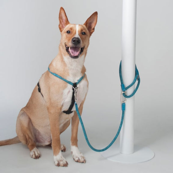 It has a handy clip integrated into the leash that makes it very easy to tie your dog to your chair or another object safely when we go for brunch or drinks with friends.