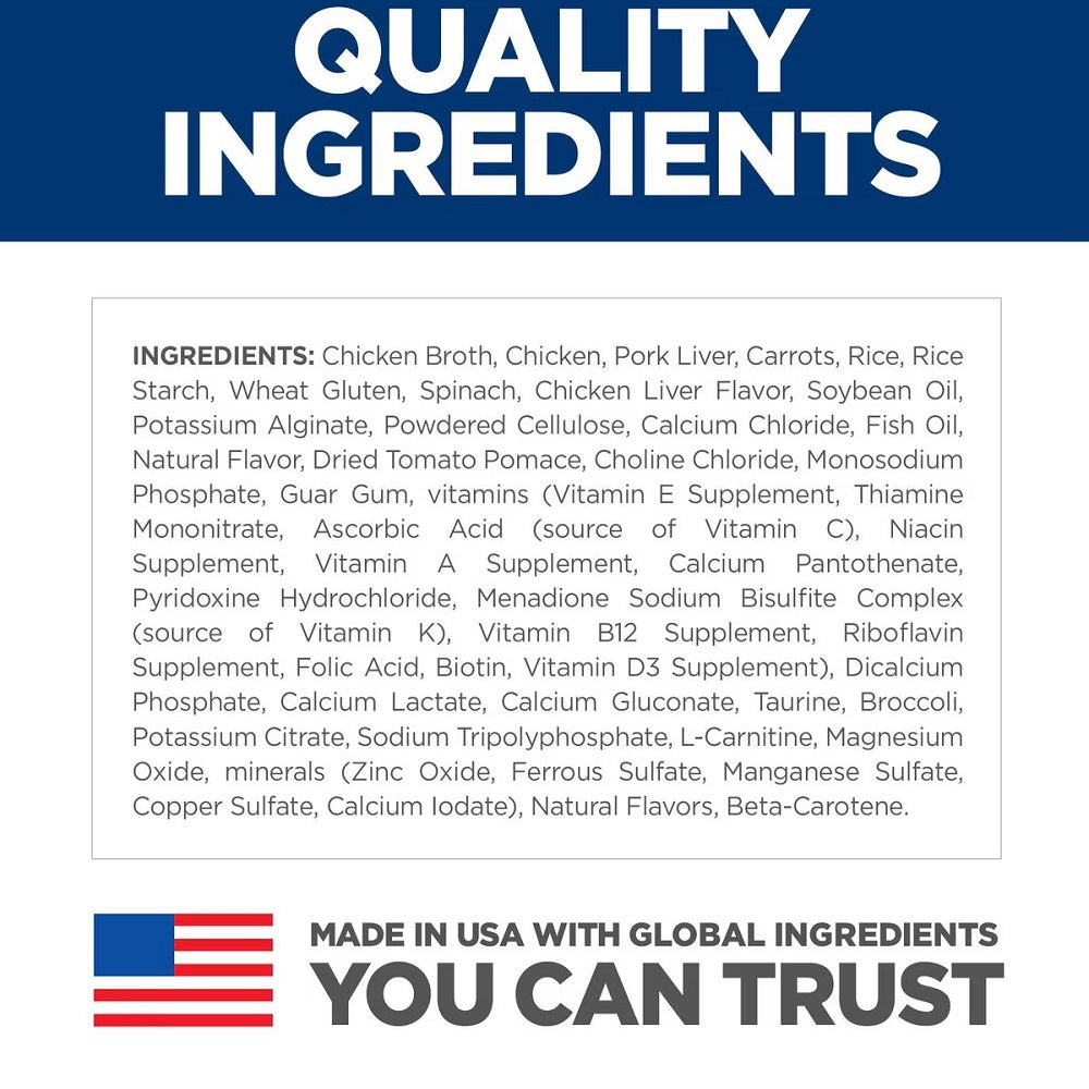Developed by Hill’s nutritionists and veterinarians, this delicious stew features tender bites of real chicken and vegetables in a savory gravy, specially formulated for cats aged 7 and older. It’s packed with clinically proven antioxidants, essential nutrients, and an optimal blend of ingredients to support brain function, energy, and healthy kidneys.