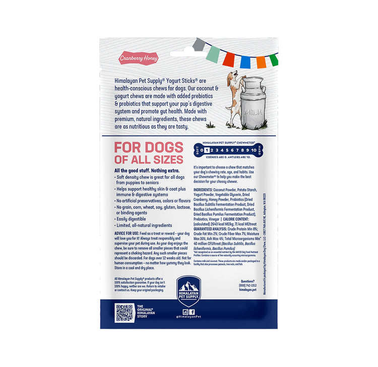 Give your pup a treat that’s as nourishing as it is delicious with the Himalayan Dog Chew Yogurt Sticks with Cranberry & Honey. These soft-density chews are crafted from a blend of yogurt and coconut—making them gentle on your dog’s digestion and packed with wholesome benefits.