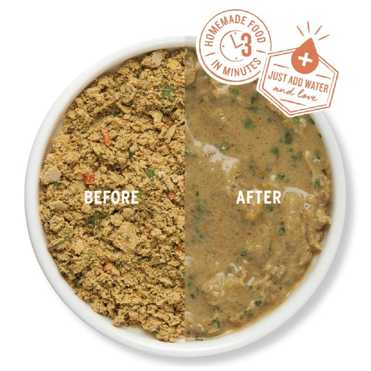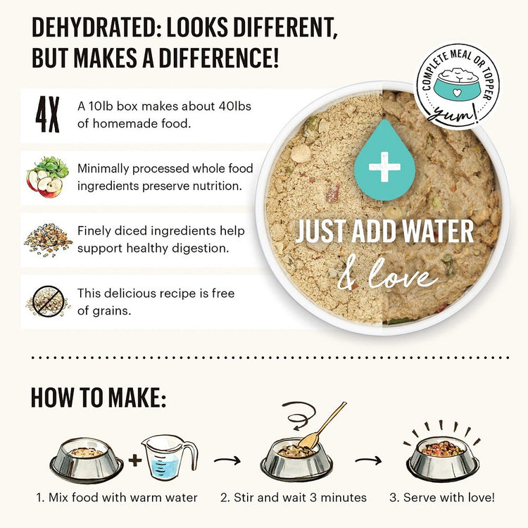 • This meal rehydrates to 4x its weight—just add warm water and serve it as an easy homemade meal or as a tasty topper for dry dog food! A 10 lb. box makes 40 lbs. of fresh food.