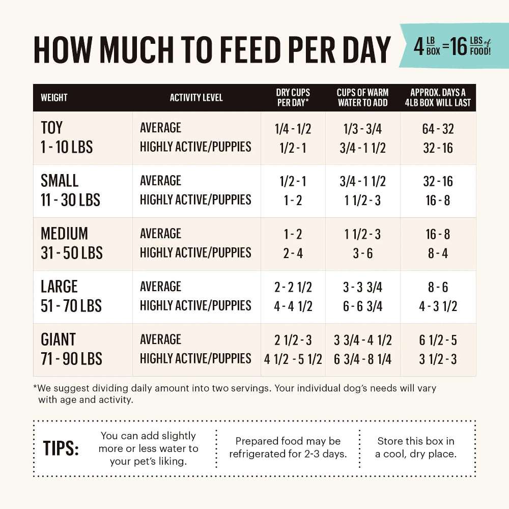 只需加溫水,等待三分鐘,就能為您和您的寵物準備一頓美味的自製餐點!*已通過家庭內AAFCO餵食測試。