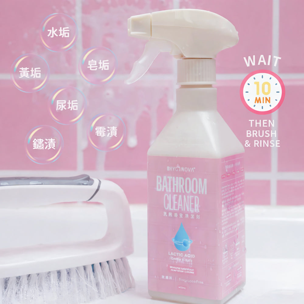Hyginova 乳酸浴室清潔劑專為浴室及寵物家庭而設,能有效處理水漬、皂垢、黃漬及尿漬,同時保持配方溫和安全。產品採用發酵乳酸配合檸檬酸,有效清潔而不產生刺激性氣味。