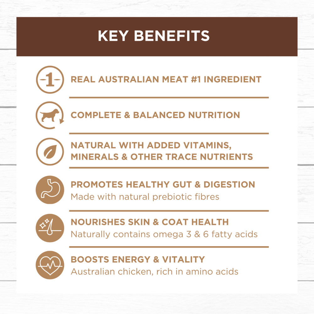 Made from premium Australian kangaroo meat, this recipe is rich in lean protein and essential amino acids to support muscle health. Added prebiotic fiber promotes a healthy digestive system, while Omega 3 and 6 fatty acids from natural ingredients help maintain a shiny coat and healthy skin.