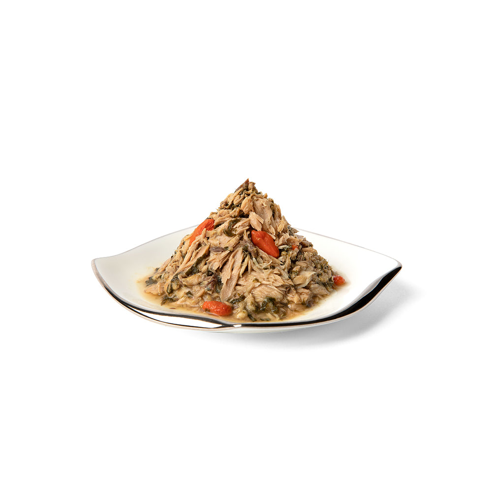 Tuna, Water, Salmon, Goji berry, Seaweed, Tricalcium phosphate, Tuna oil, Sunflower seed oil, Taurine, Choline chloride, FOS, Yucca extract, Zinc sulphate, Magnesium sulphate, Sodium chloride, Potassium chloride, Vitamin E, Vitamin B3, Ferrous sulphate, Calcium Pantothenate, Vitamin A, Copper sulphate, Vitamin B1, Vitamin B6, Vitamin B2, Manganese sulphate, Folic acid, Potassium iodide, Vitamin K, Biotin, Vitamin B12