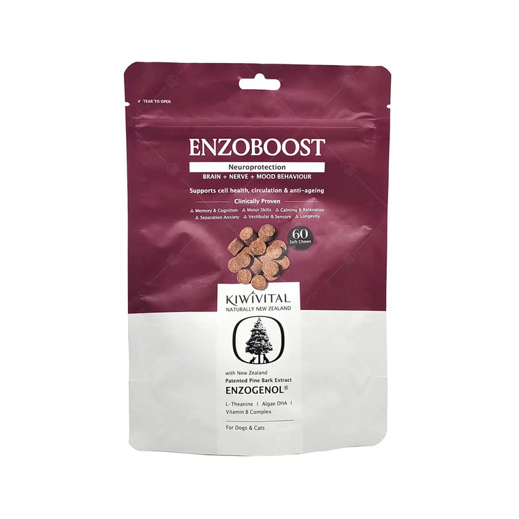 Kiwivital Enzoboost Neuroprotection Chews are advanced daily supplements formulated to support brain, nerve, and emotional wellness in both dogs and cats. Made with wild-grown New Zealand pine bark extract and produced using patented pure water extraction technology, this formula is designed to preserve ingredient purity and activity while delivering targeted neuroprotective support.