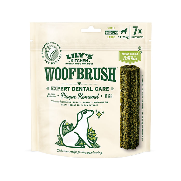 We believe all pets deserve proper food, and that’s still true when it comes to dental chews. Because dogs eat their ‘toothbrush and toothpaste’ (their dental chew), it’s important that their chew is as kind to their tummy as it is to their teeth. Woofbrush has been carefully crafted with help from our pet dental expert to make sure it works brilliantly, and uses top notch natural ingredients like parsley, coconut oil and fennel for a proper clean without the added nonsense.