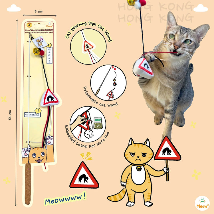 Meow² Cat Warning Sign 柔軟逗貓棒以可愛又搞笑的「貓咪警告標誌」造型設計,搭配 47cm 長棒,為您的貓咪帶來充滿活力的互動遊戲體驗。