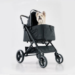Practical for both pets and humans, this stroller includes two leash clips, a drink holder, and generous undercarriage storage. Multiple hood openings allow ventilation or privacy, depending on your pet’s needs. Best of all, the Peach is made of waterproof, dirt-resistant fabric that’s easy to clean and durable for everyday adventures.