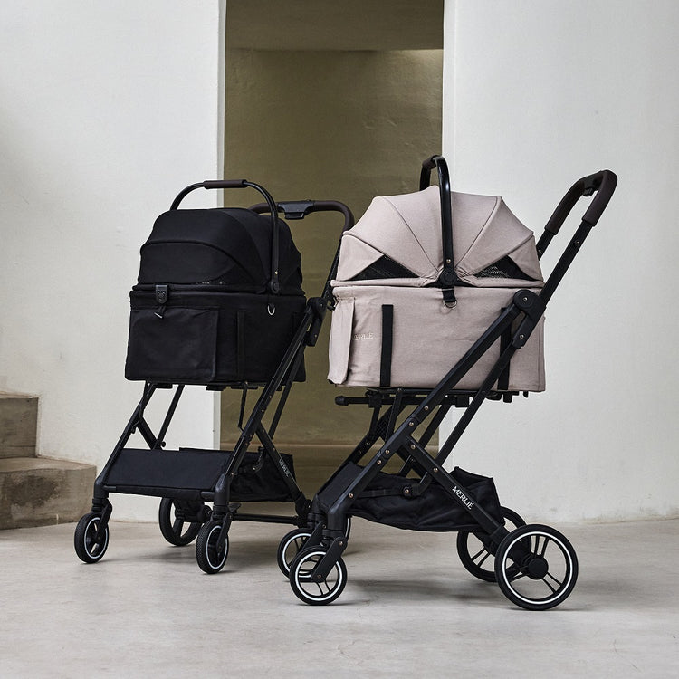 介紹 Merlie Peach 寵物手推車(MW3)——這款來自韓國設計的手推車,是深受歡迎的 Clementine 款式的升級版。為需要更多空間的寵物家庭打造,外型優雅且功能實用,車廂空間增加了 50%,適合體型較大的寵物或多隻寵物同乘。