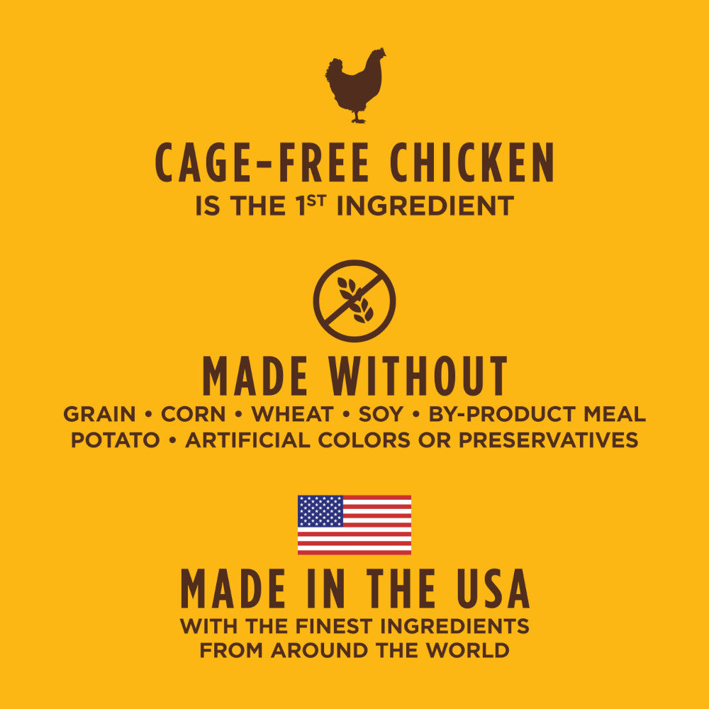 • Made without - grain, potato, corn, wheat, soy, by-product meal, artificial colors or preservatives