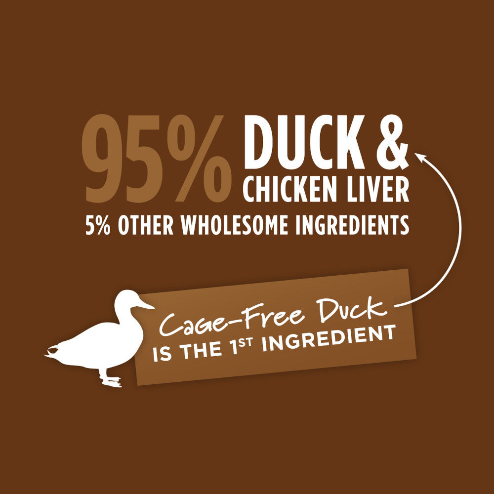 • 95% duck & chicken liver; 5% vegetables, fruits & other wholesome ingredients; 0% grain