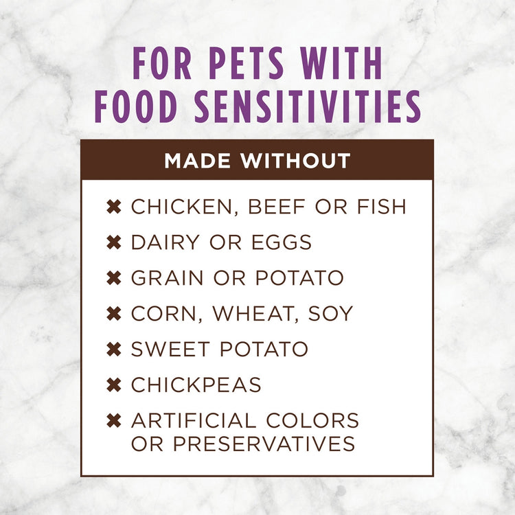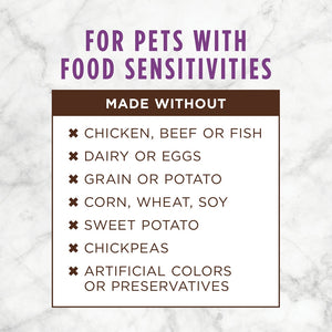 • Made without - grain, dairy, eggs, chicken, beef, fish, sweet potato, potato, chickpeas, corn, wheat, soy, artificial colors or preservatives