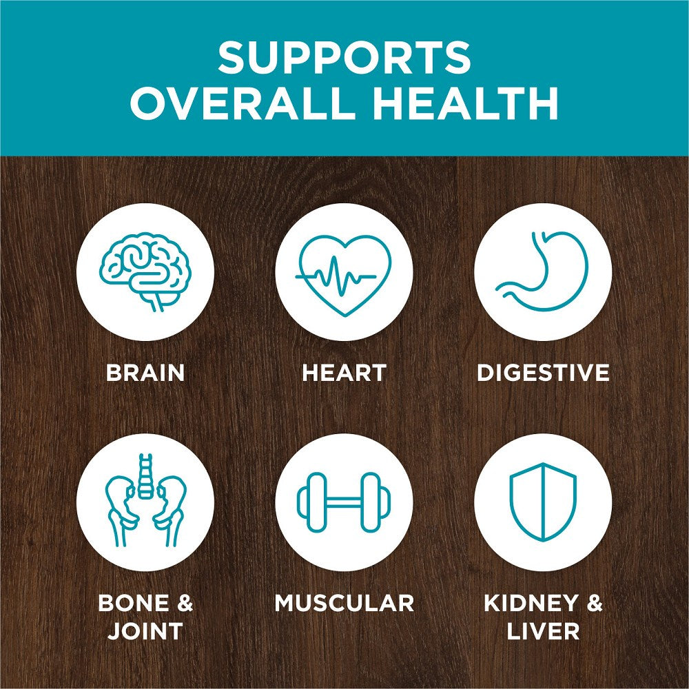 • Liver support through choline, B vitamins, and trace minerals and kidney support from fish oil