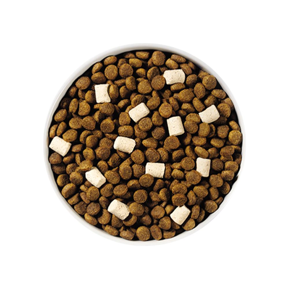 豐富蛋白,營養豐富食物,加上一口大小的凍乾生肉,混合凍乾肉類穀物狗乾糧雞肉 & 糙米配方可餵食乾糧的更好方法。釋放狗狗的成長潛能,將更多純淨,真實的生肉營養放入每份食糧當中。