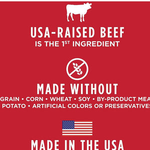 • Never contains any grain, potato, corn, wheat, soy, by-product meal, artificial colors or preservatives.