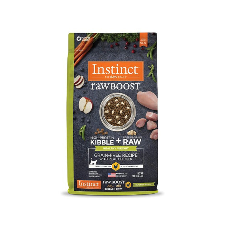 • Cage-free chicken is the first ingredient so it’s packed with animal protein for strong, lean muscles—for 25% less fat and • 15% fewer calories than Instinct Raw Boost