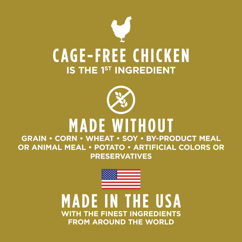 - Made without - grain, potato, corn, wheat, soy, by-product meal, artificial colors or preservatives