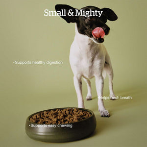 • Tailored for small breed dogs, with breath-freshening ingredients parsley and peppermint, and small kibble for tiny teeth.