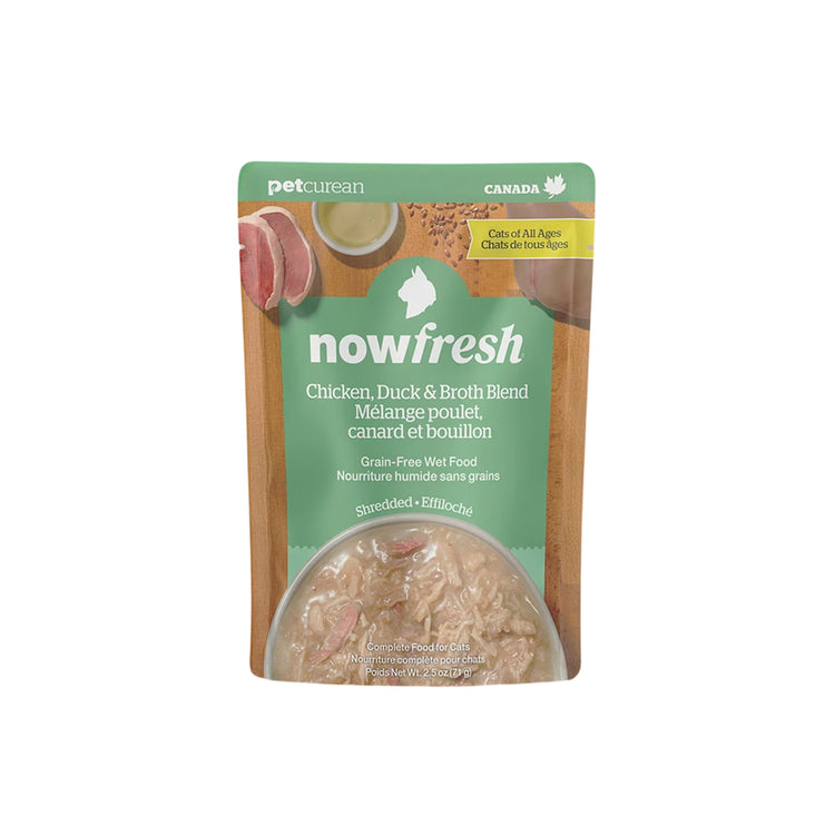 Now Fresh 無穀物全營養雞肉、鴨肉及肉湯貓濕糧,選用新鮮去骨雞肉及鴨肉,肉絲質感配合香濃肉湯,提供優質蛋白質及高水分含量,讓貓咪在享受美味的同時補充每日所需水分。