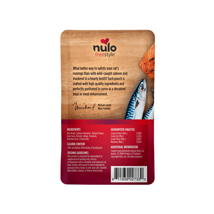Delight your cat with the irresistible taste of the Nulo FreeStyle Chunky Salmon & Mackerel Broth, made with wild-caught salmon and mackerel in a savory meaty broth. Each pouch is perfectly portioned to serve as a decadent treat or a flavorful meal topper, crafted with high-quality natural ingredients that cats love.