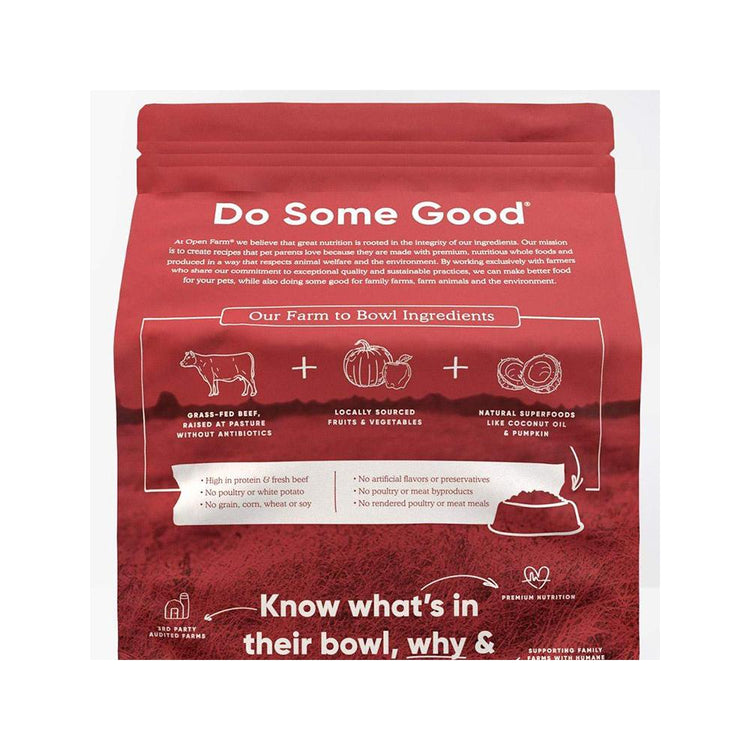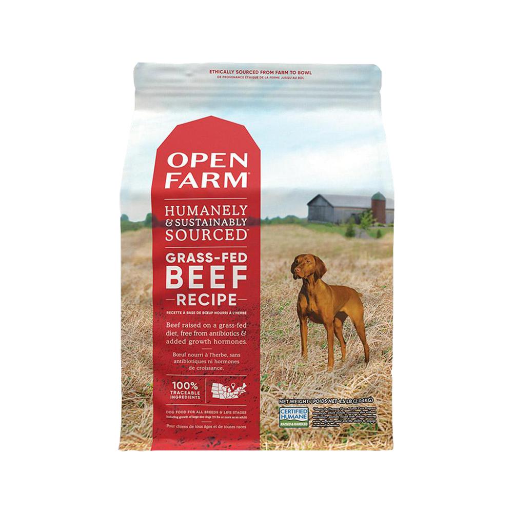 Better meat from better places Open Farm only sources meat and poultry from third-party verified family farms that employ humane farming practices, meaning animals are raised naturally with a nutritious diet, enough space to roam and engage in their natural behaviors, and no antibiotics. Why? It's because the healthier, happier animals are, the more nutritious beef, pork and poultry are for your pet.