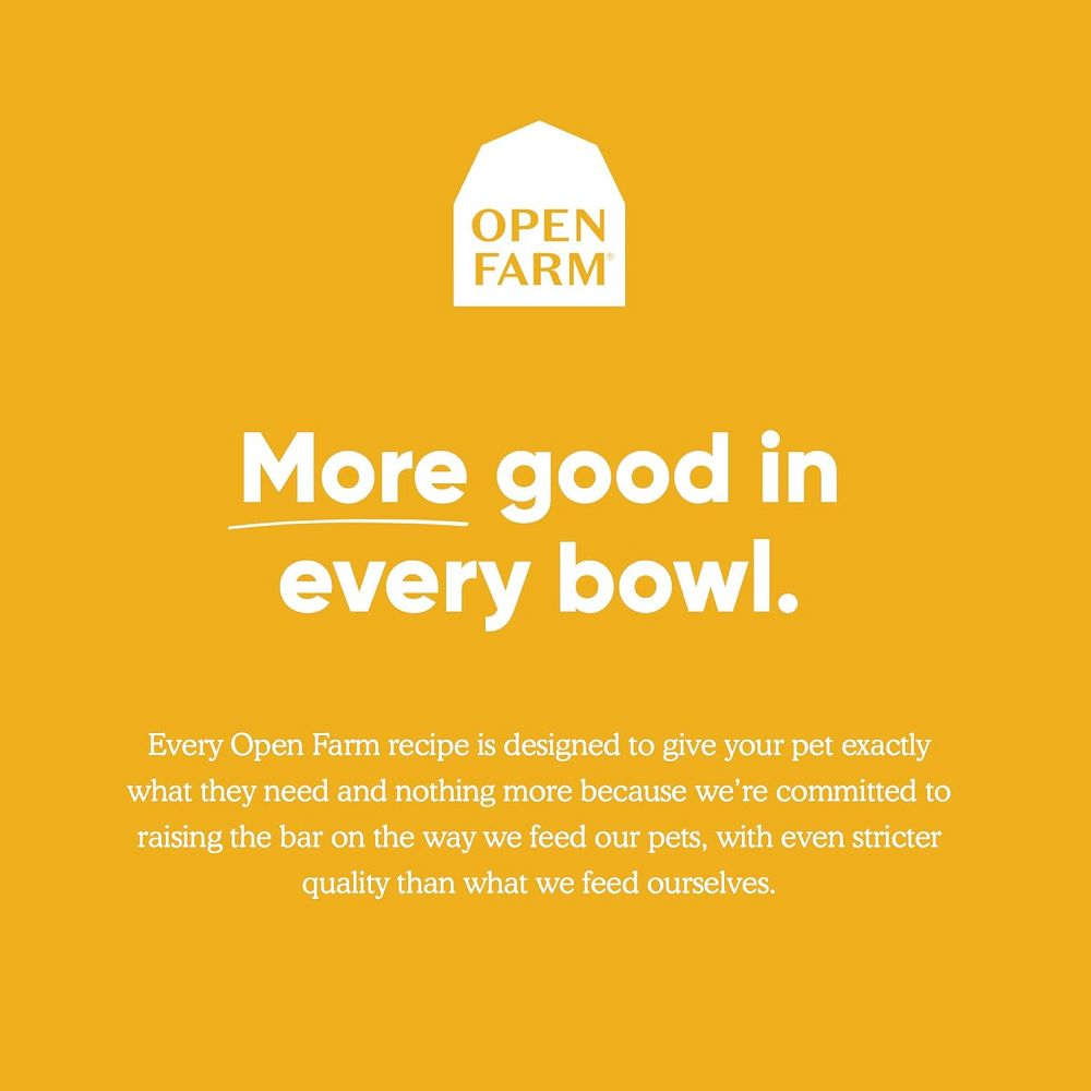 About Open Farm - Do some good for your pet, farm animals and environment all at once**Rethinking how pet food is made, Open Farm is not only about sourcing the highest quality ingredients, but also about supporting farmers who treat their animals right, and providing full transparency to customers. Better meat from better places Open Farm only sources meat and poultry from third-party verified family farms that employ humane farming practices, meaning animals are raised naturally with a nutritious diet, enough space to roam and engage in their natural behaviors, and no antibiotics. Why? It's because the healthier, happier animals are, the more nutritious beef, pork and poultry are for your pet. The same goes for fish Using exclusively wild-caught fish, Open Farm only works with fisheries that follow the most current Ocean Wise sustainability standards to protect the marine environment and ocean floor. Trace every single ingredient to its source Did you know you can trace the source of every ingredient in an Open Farm product instantly by scanning the lot code on the bag? That's the level of transparency the brand is willing to give its customers.Pet Products Delivered Your Way