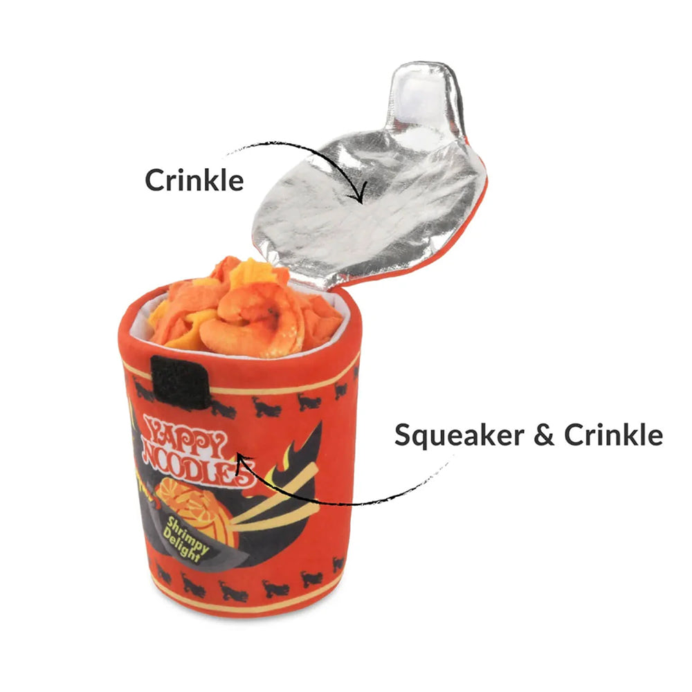 Serve up a playful bowl of fun with the P.L.A.Y. International Classic Cup of Noodles, a plush dog toy inspired by everyone’s favorite comfort snack. Designed to bring extra excitement to your pup’s day, this adorable noodle cup is packed with engaging details including a hidden squeaker, crinkly textures, and soft felt noodles that are perfect for tugging, tossing, and interactive play. It is a fun sensory toy that keeps dogs entertained while adding a little novelty to their toy collection.