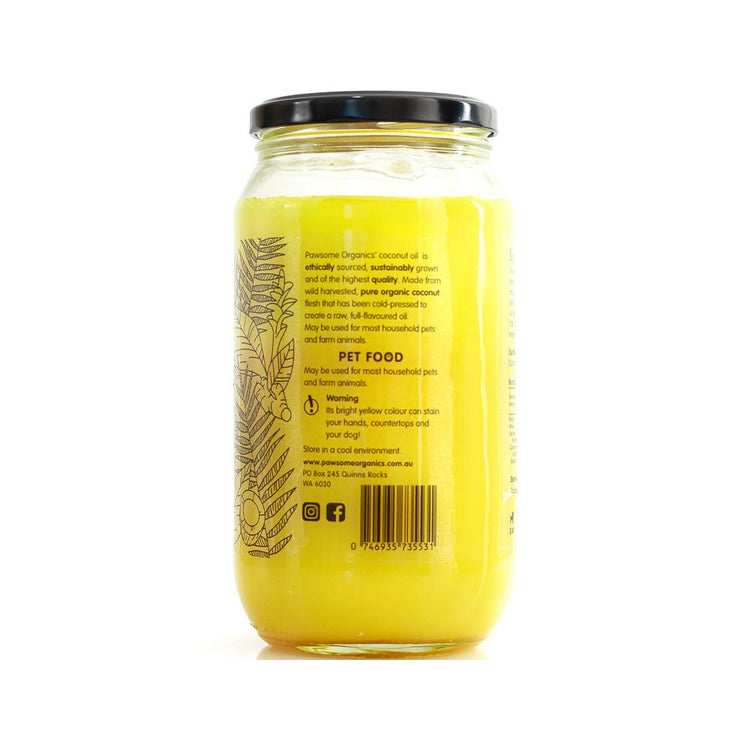 Pawsome Organics' coconut oil is ethically sourced, sustainably grown and of the highest quality. Made from wild harvested, pure organic coconut flesh that has been cold-pressed to create a raw, full-flavoured oil. May be used for most household pets and farm animals.