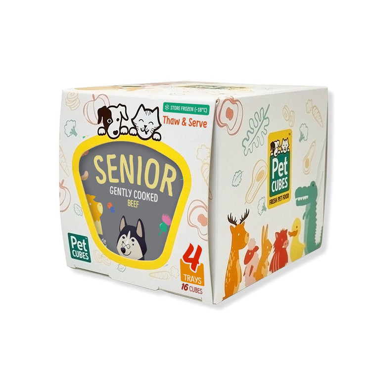 PetCubes Senior Beef is a gently cooked diet prepared at 80˚C. A special formulation by Dr Cabana, this diet is optimised for dogs 7 years old and up. Senior dogs have a unique set of nutrient requirements and this formulation aims squarely at fortifying Buddy Sr's health.