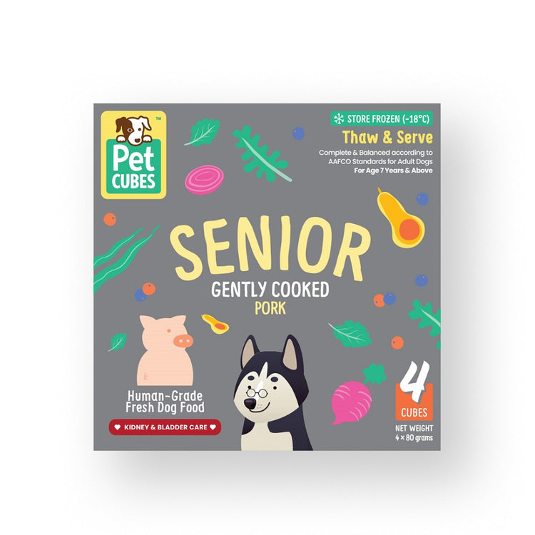 PetCubes Senior Pork is a gently cooked diet prepared at 80˚C. A special formulation by Dr Cabana, this diet is optimised for dogs 7 years old and up. Senior dogs have a unique set of nutrient requirements and this formulation aims squarely at fortifying Buddy Sr's health.