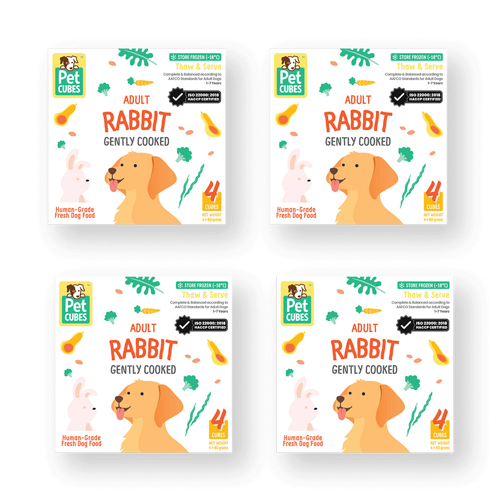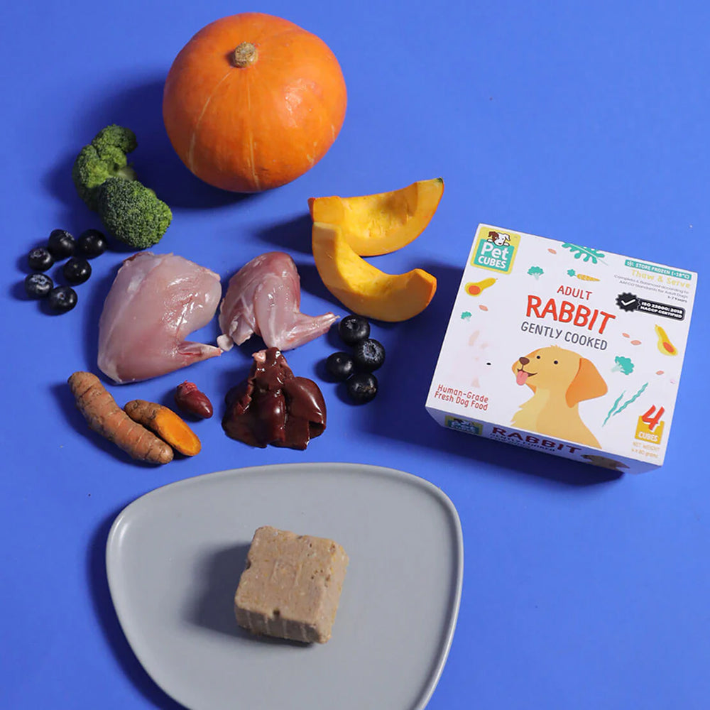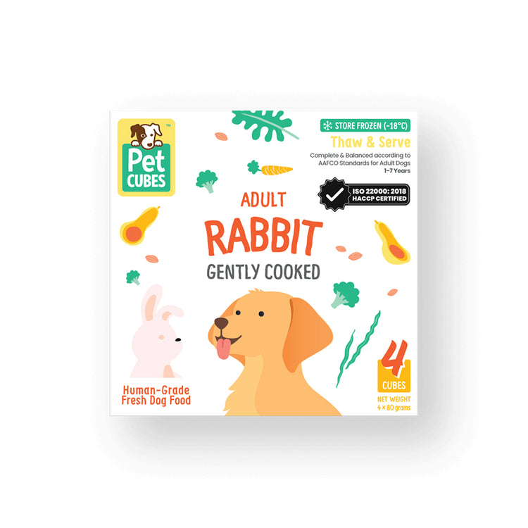 PetCubes Frozen Fresh Human-Grade Gently Cooked Rabbit Adult Dog Food is a premium complete meal designed for adult dogs, especially those with food sensitivities or delicate digestion. Using rabbit as a novel and lean protein, this recipe provides balanced nutrition while remaining gentle on the stomach.