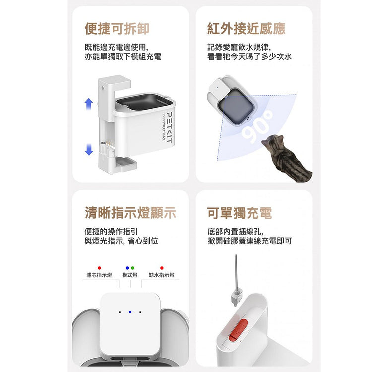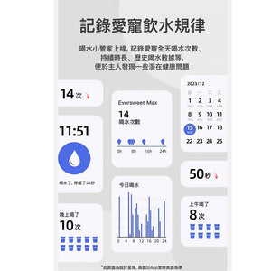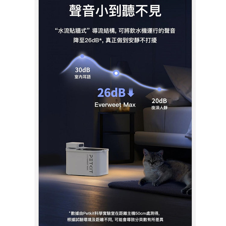 Eversweet Max 的噪音低於26分貝,能確保您和寵物的安寧睡眠。可拆卸的水箱設計使清洗變得輕鬆,無線水泵設計避免了纏繞線的困擾。用Eversweet Max 無線智能寵物飲水噴泉為您的寵物送上新鮮潔淨的水吧。