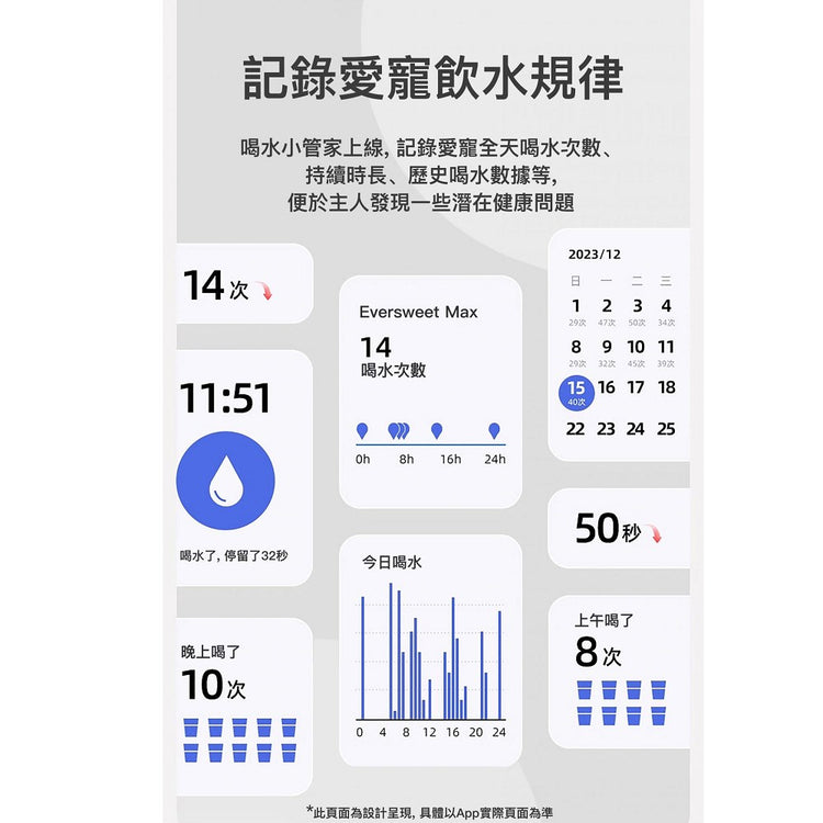 通過PETKIT應用程序,您可以實時監測寵物的飲水習慣,包括他們每天的飲水頻率和持續時間。該應用程序還基於寵物的飲水習慣生成每週和每月的數據洞察,確保您不會忘記更換濾芯或使用應用程序提醒清洗噴泉。
