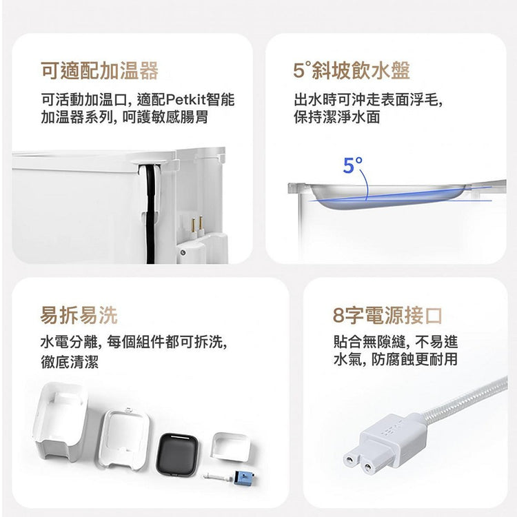 • Smart App Monitoring: 24/7 Pet’s Drinking Habit Tracking View your furry friends’ real-time drinking record, daily drinking frequency and duration. PETKIT app will generate weekly and monthly drinking insights based on pets’ hydration habits. Never forget to change your filter and clean your pet's water fountain again with in-app reminders.