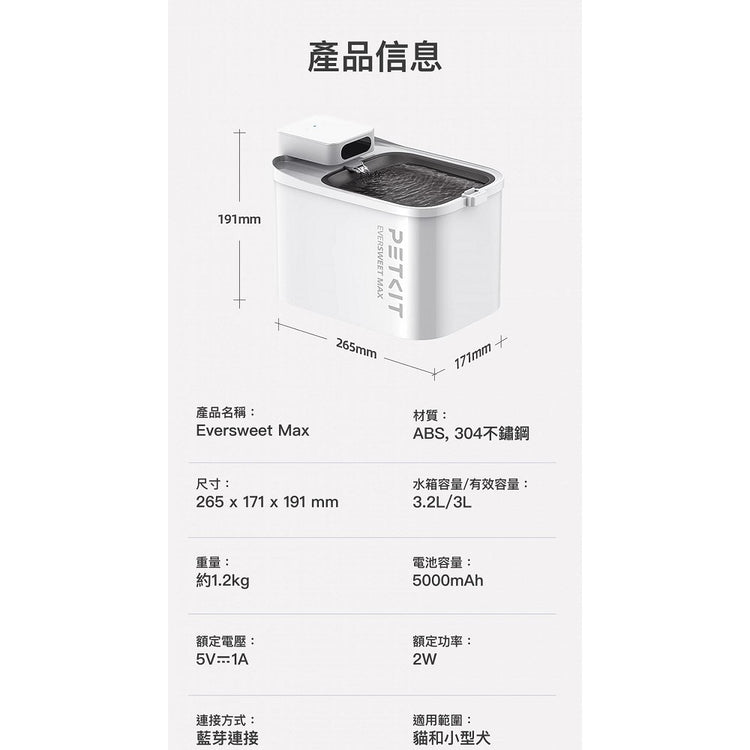 Eversweet Max 擁有3升(105液盎司)的大容量,非常適合於多寵物家庭。告別頻繁補水的麻煩,這個分配器可為兩隻貓或一條狗提供一週的水量供給。